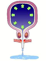 This is the leakage of urine from chronically full bladders due to long-standing blockage e.g. from an enlarged prostate (BPH) or weak bladder muscles, e.g. in elderly, diabetics. [Fig 7]. The leak typically occurs upon getting up from a lying position or upon straining and can be difficult to distinguish from stress incontinence. This incontinence is suspected when one finds a distended bladder on examining the abdomen. Urodynamics can confirm this type of incontinence. In the case of overflow incontinence form a weak bladder muscle, treatment consist of a cholinergic drug e.g. Ubretid or by self-catheterisation using a soft silicon catheter. If a BPH is found, then prostate surgery (TURP) is recommended.